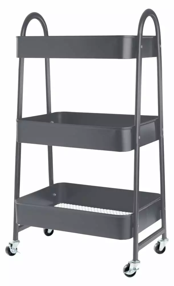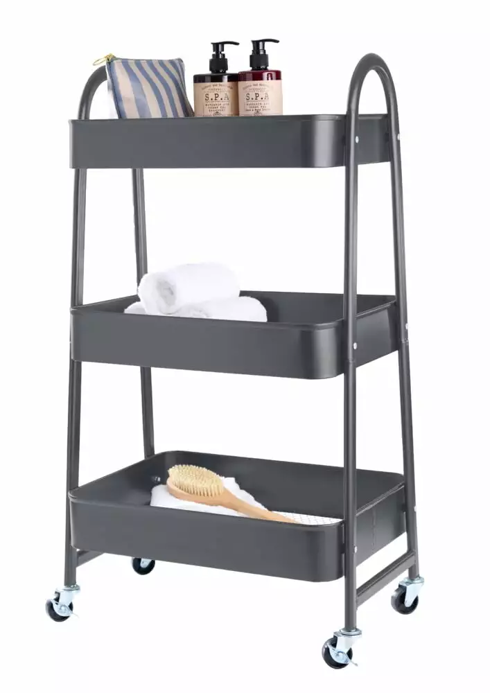 Praktisk avlasningsbord med tre hyller. Denne har hjul slik at den lett kan flyttes. På to av hjulene er det bremser slik at den står stødig der du vil ha den. .