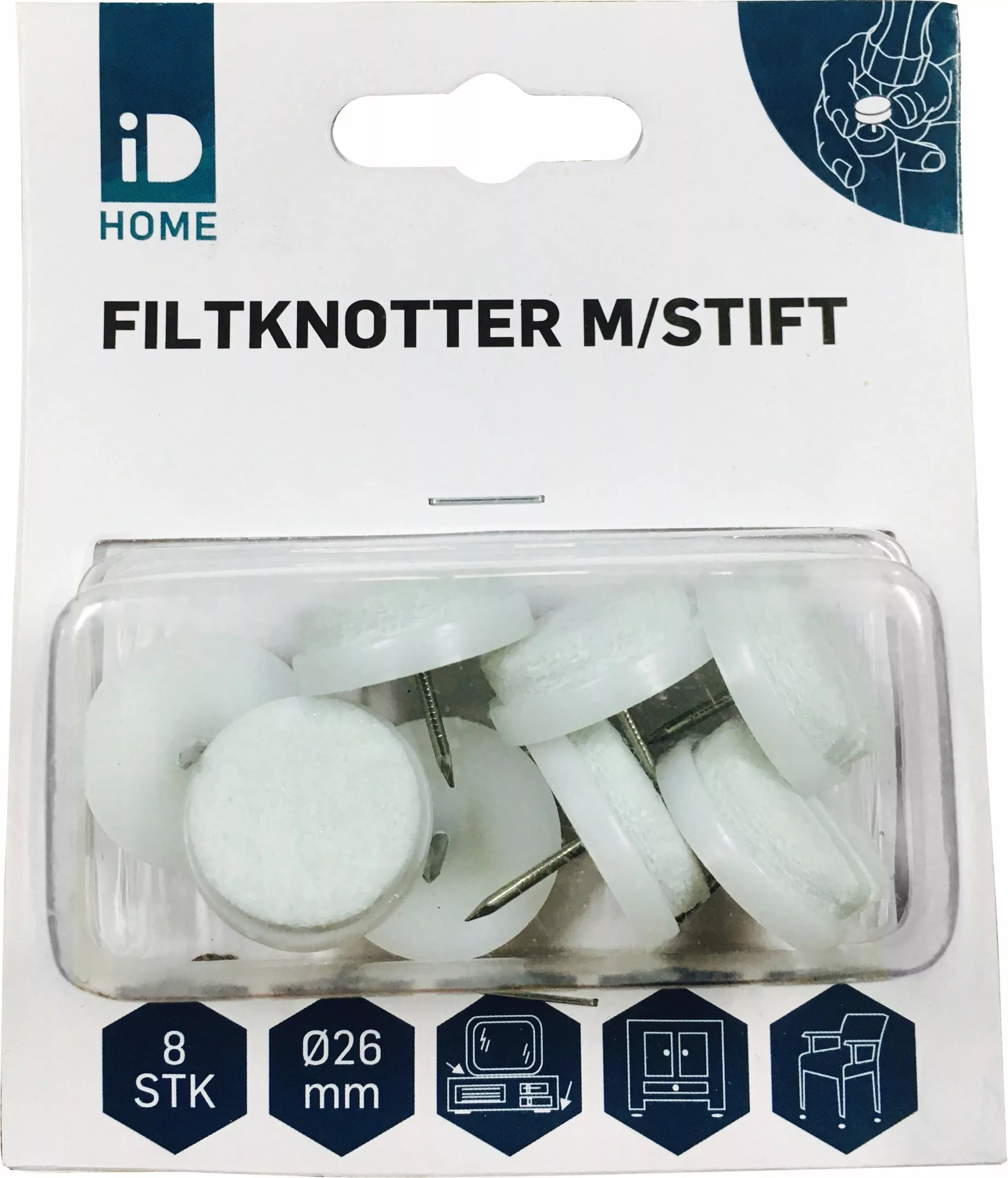 ID Home filtknott m/stift 22 mm er møbelknotter med spiker som beskytter gulvet. Kommer i pakke á 12 stk.