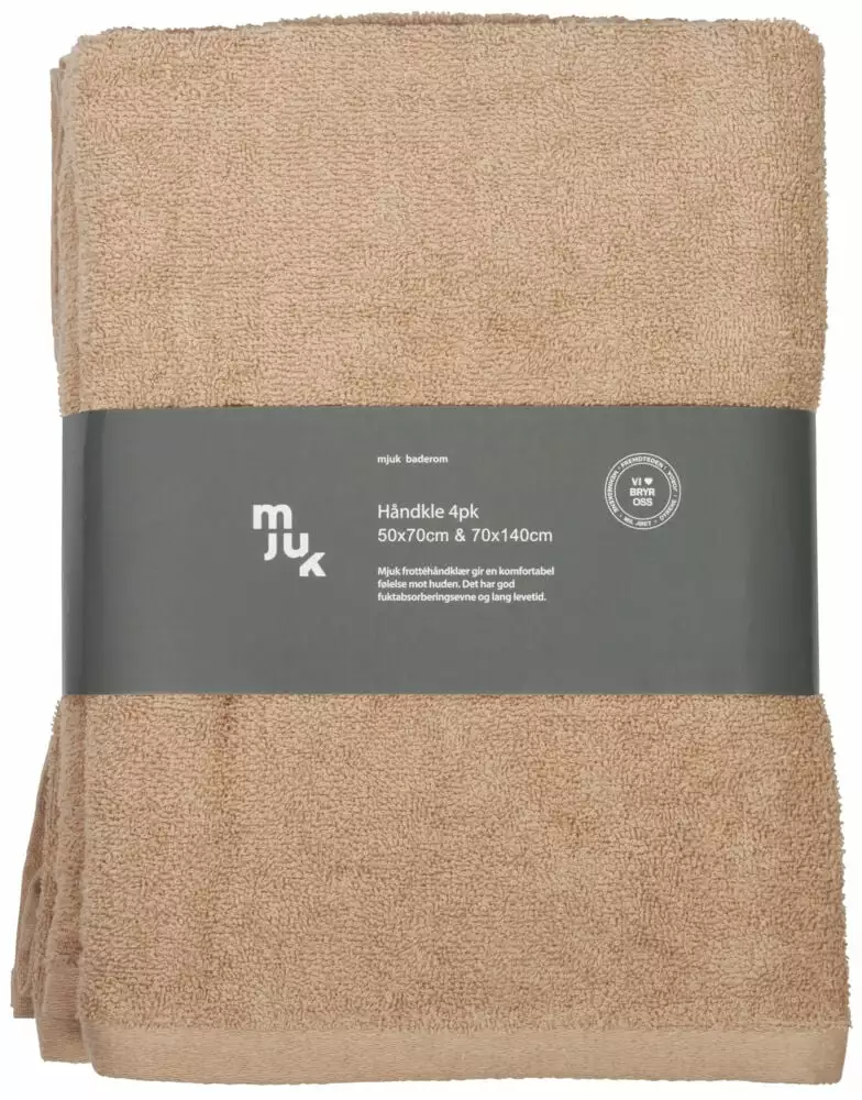 Mjuk frotte håndkleserie er produsert i 100% bomull. Fyldige kvalitets håndklær – 400 g/m² – som tørker meget godt og er slitesterke. Tåler vask på 60 grader og kan tørketromlers. I pakken kommer to håndklær i størrelsen 50×70 cm og to håndklær i størrelsen 70×140 cm.