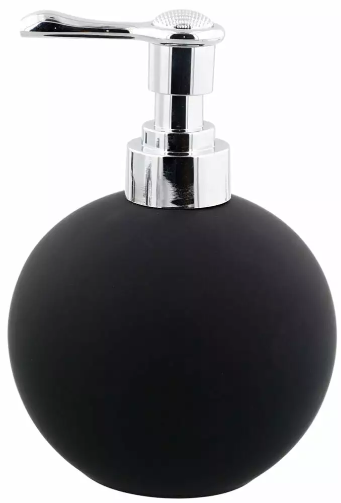 Såpedispenser i porselen med matt gummilakkering og plast med forkrommet lakkering.