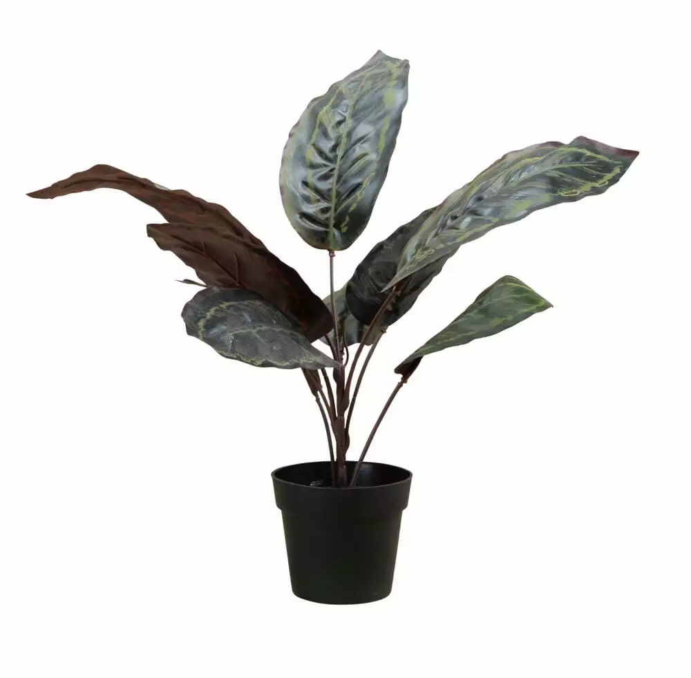 Calathea plante i potte. Finnes i to ulike fargekombinasjoner, grønn og rød/grønn. Kunstig plante i naturtro utseende. Vedlikeholdsfri og allergivennlig. Størrelse Ø29cm H37cm.